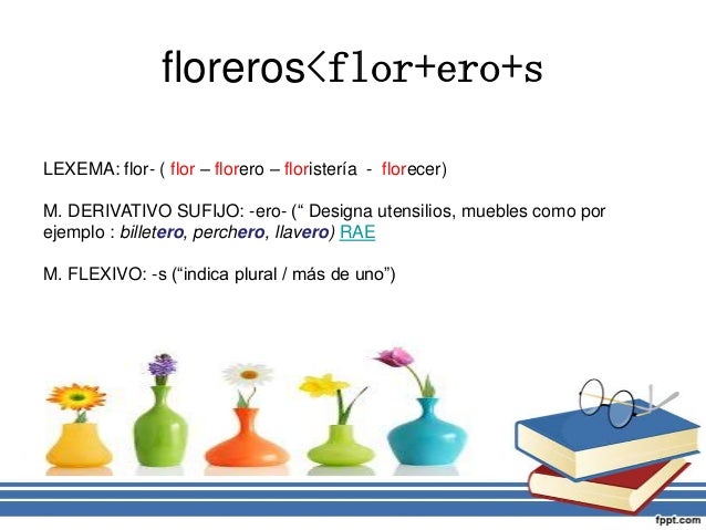4. floreros<flor+ero+s LEXEMA: flor- ( flor – florero – floristería - florecer) M. DERIVATIVO SUFIJO: -ero- (“ Designa utensilios, muebles como por ejemplo : billetero, perchero, llavero) RAE M. FLEXIVO: -s (“indica plural / más de uno”)