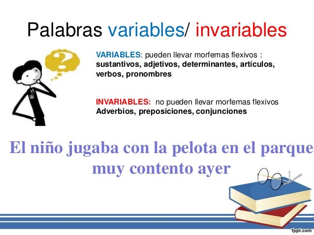 5. Palabras variables/ invariables El niño jugaba con la pelota en el parque muy contento ayer VARIABLES: pueden llevar morfemas flexivos : sustantivos, adjetivos, determinantes, artículos, verbos, pronombres INVARIABLES: no pueden llevar morfemas flexivos Adverbios, preposiciones, conjunciones
