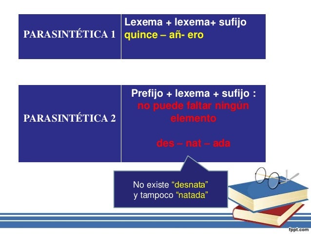 8. PARASINTÉTICA 2 Prefijo + lexema + sufijo : no puede faltar ningún elemento des – nat – ada PARASINTÉTICA 1 Lexema + lexema+ sufijo quince – añ- ero No existe “desnata” y tampoco “natada”
